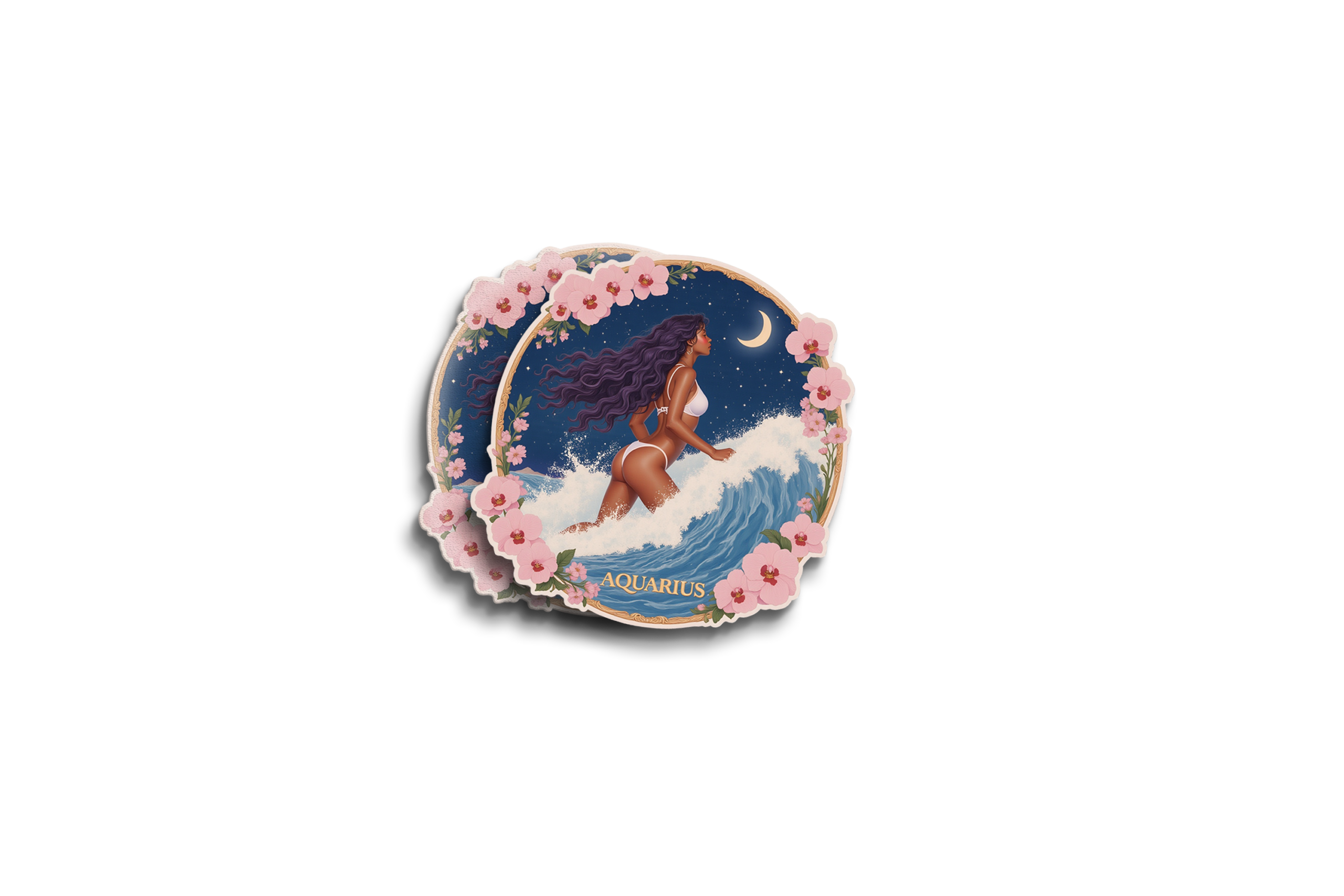 The Water Bearer in full cosmic glory. This vibrant Aquarius sticker features a bold illustration of the zodiac’s rebel riding ocean waves under a crescent moon, surrounded by soft pink blooms.